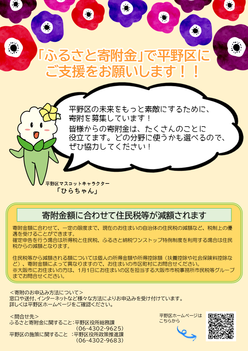 皆様のご寄附により、平野区のまちづくりをサポートしていただきますよう、ご協力をよろしくお願いいたします。