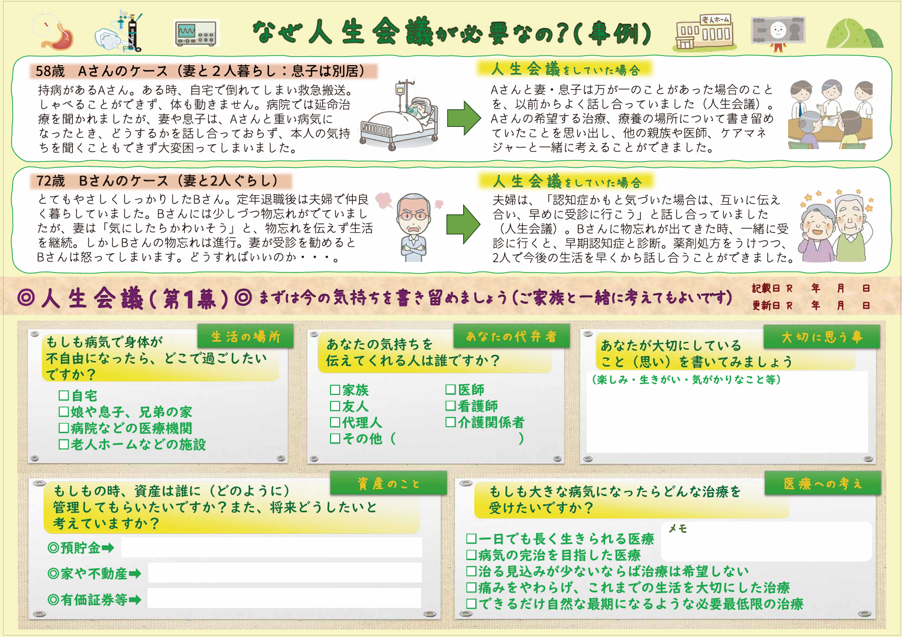 これからの人生をどう生きるかを考える「あたな自身の会議」です。医療・介護・住まい・お金のことなど年齢問わず、誰にでも必要なACP「人生会議」について、一緒に考えてみましょう。