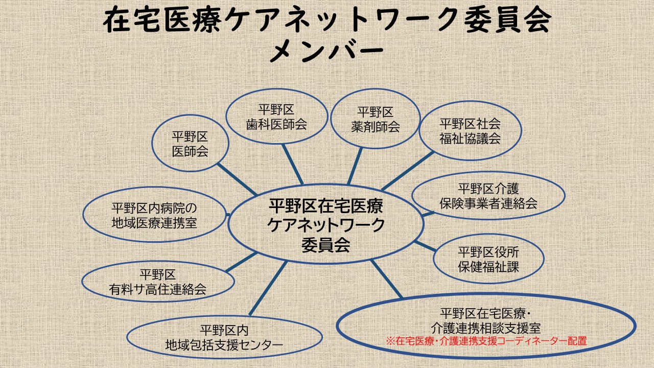 在宅医療と介護の連携推進に向け、在宅医療の現状について共通認識を深め、連携方法や取組等について検討、協議、進捗管理を行う場として、区内の医療と介護の関係者で構成した平野区在宅医療ケアネットワーク委員会を設置しています。