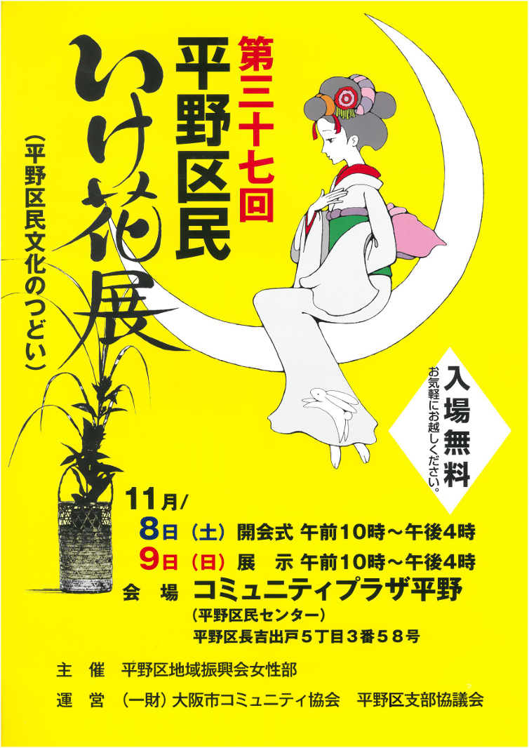 いけ花展は、「平野区民文化のつどい」として、平野区地域振興会女性部主催で開催されており、今回で37回目を迎えました。