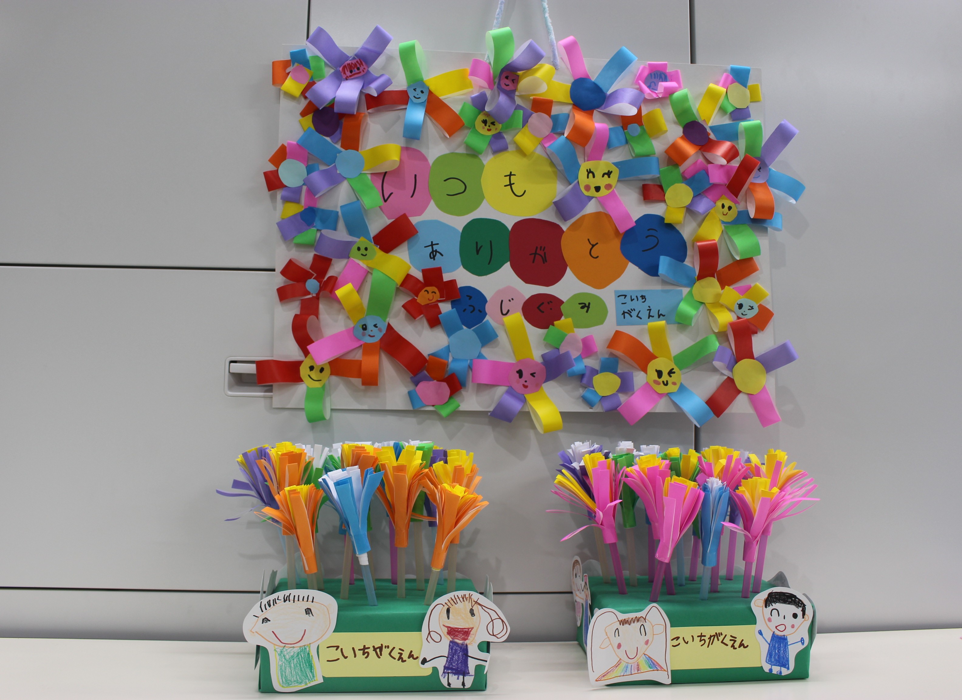 子どもたちは、日ごろの感謝の気持ちを込めて、元気な声であいさつをしてくださいました。また、手作りの花の作品も職員に贈られました。