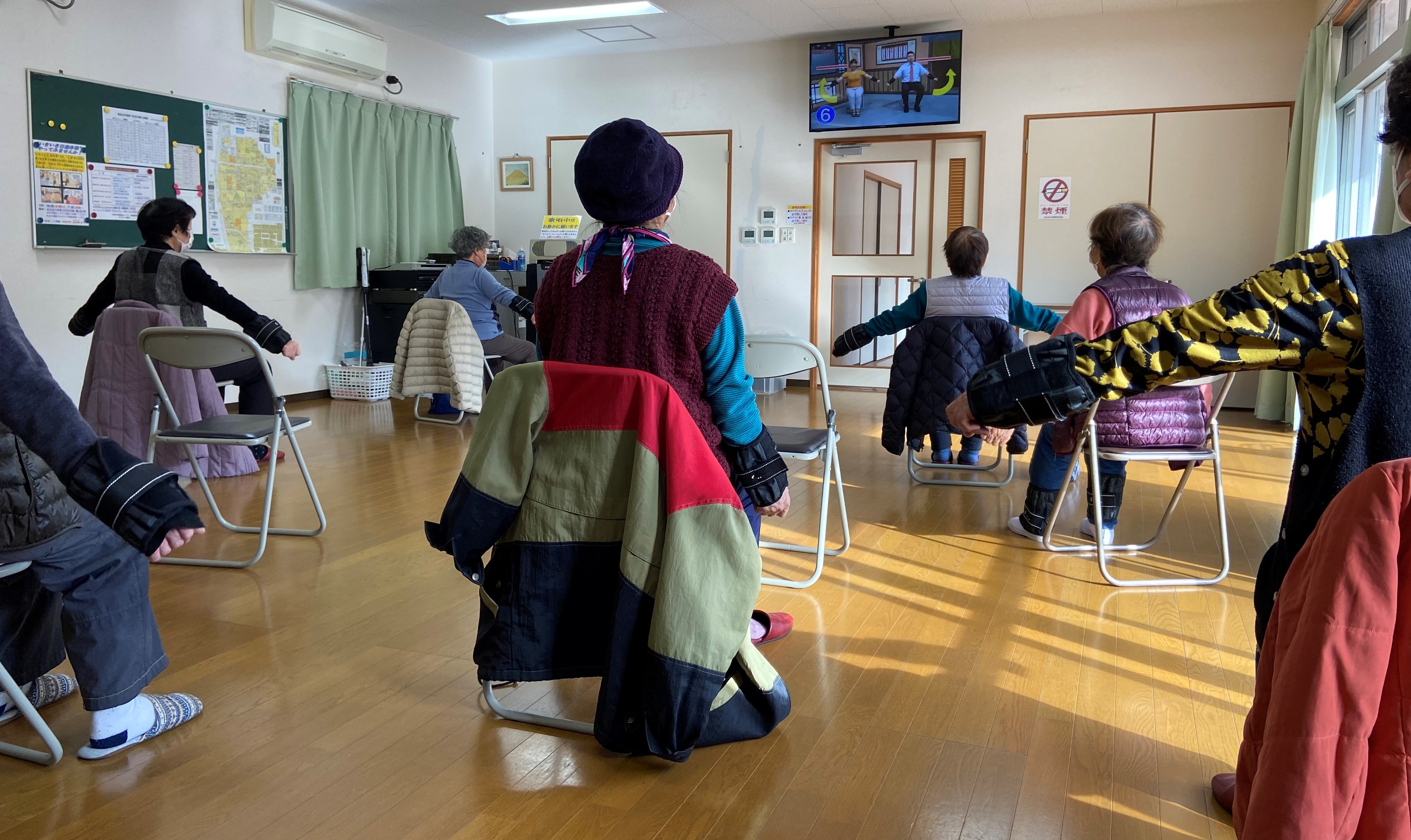 体操以外にも「ひらの百歳☆きらめき講座」も取り入れており、訪問看護師や警察官などの講師が無償で講座を実施してくださっています。当日は訪問看護師の方が「日本は地震大国で…」と防災について話し出すと、皆さん、資料をまじまじと見て興味深そうに話を聞いていらっしゃいました。