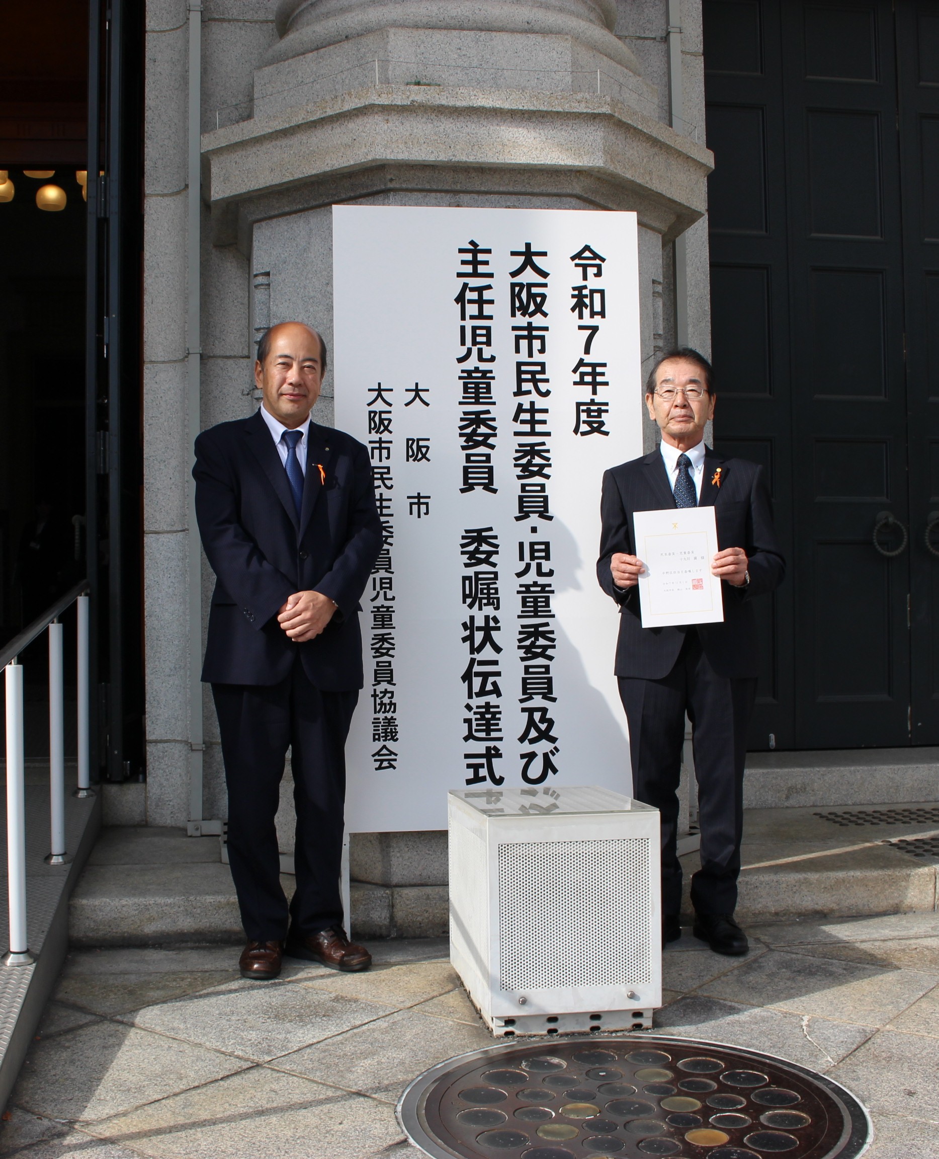 この度の一斉改選にあたって、12月1日(月曜日)に大阪市中央公会堂にて「令和7年度 大阪市民生委員・児童委員委嘱状伝達式」が開催され、新任委員と区代表受領者が出席されました。平野区からは区代表受領者として十九川委員がご出席され、山本副市長より向こう3年間の市長からの委嘱状の伝達を受けられました。