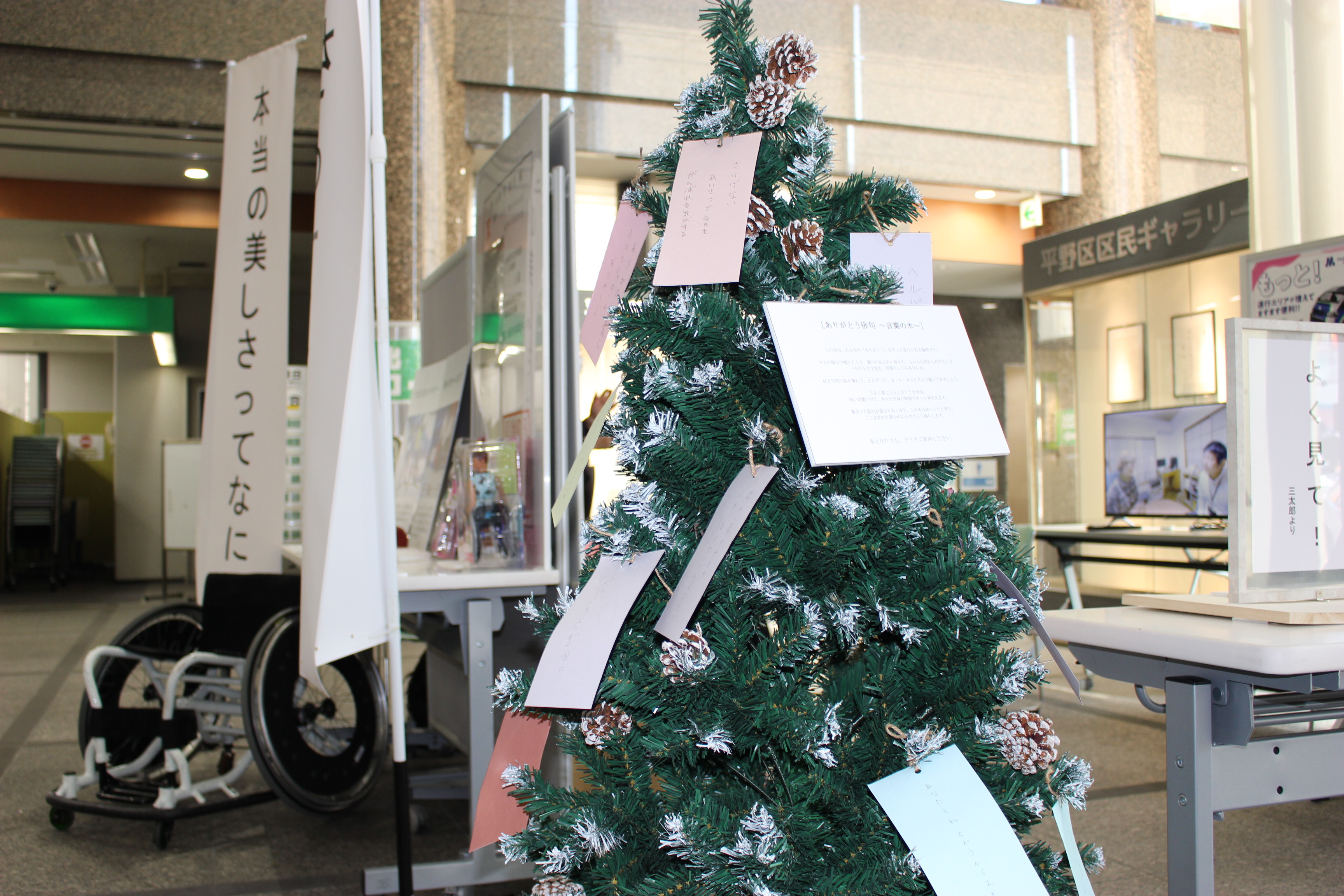 見学や体験をしていただいた区民の皆さまには、ご感想や願いを込めた短冊をクリスマスツリーにたくさん飾っていただき、ブースは温かい雰囲気に包まれました。