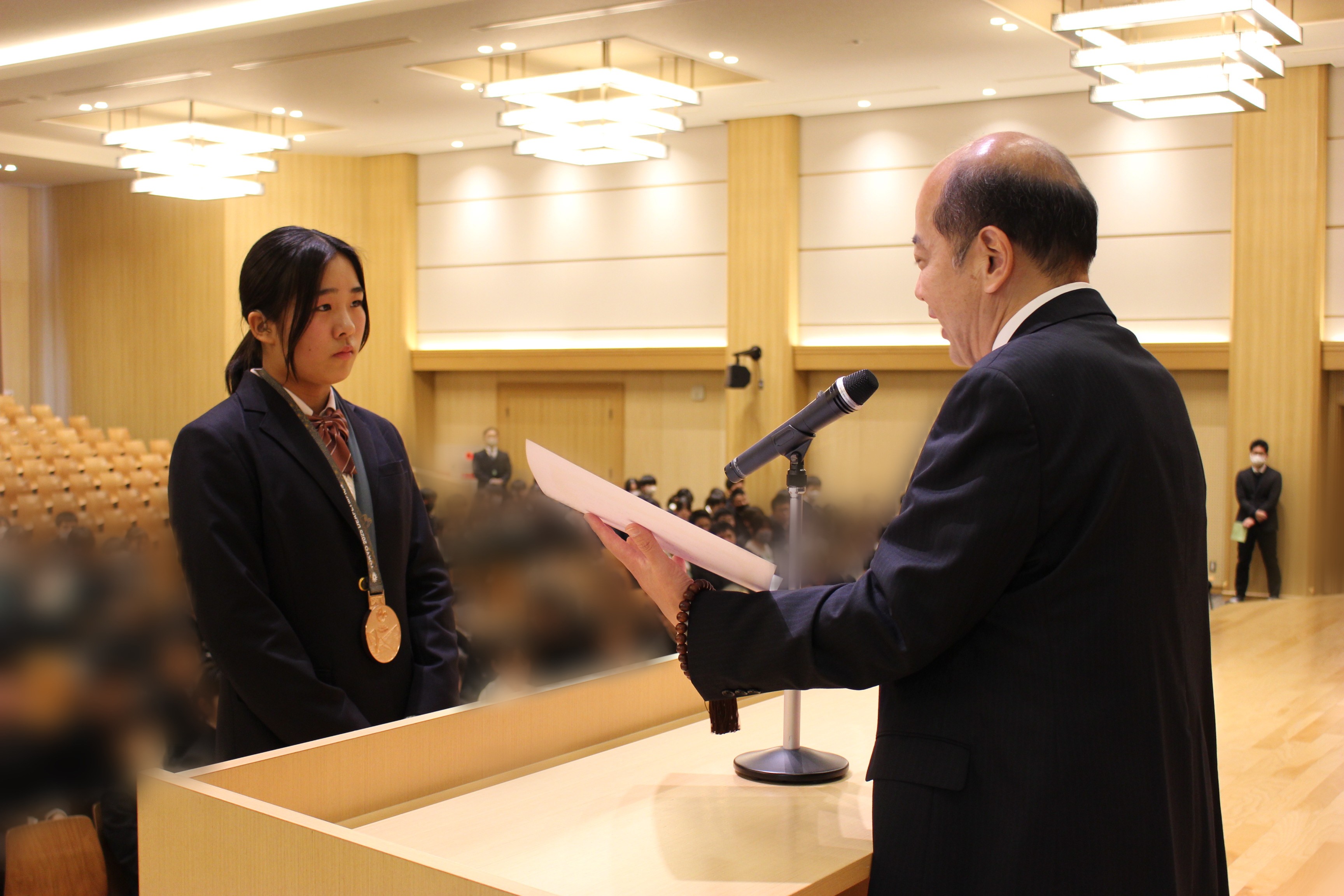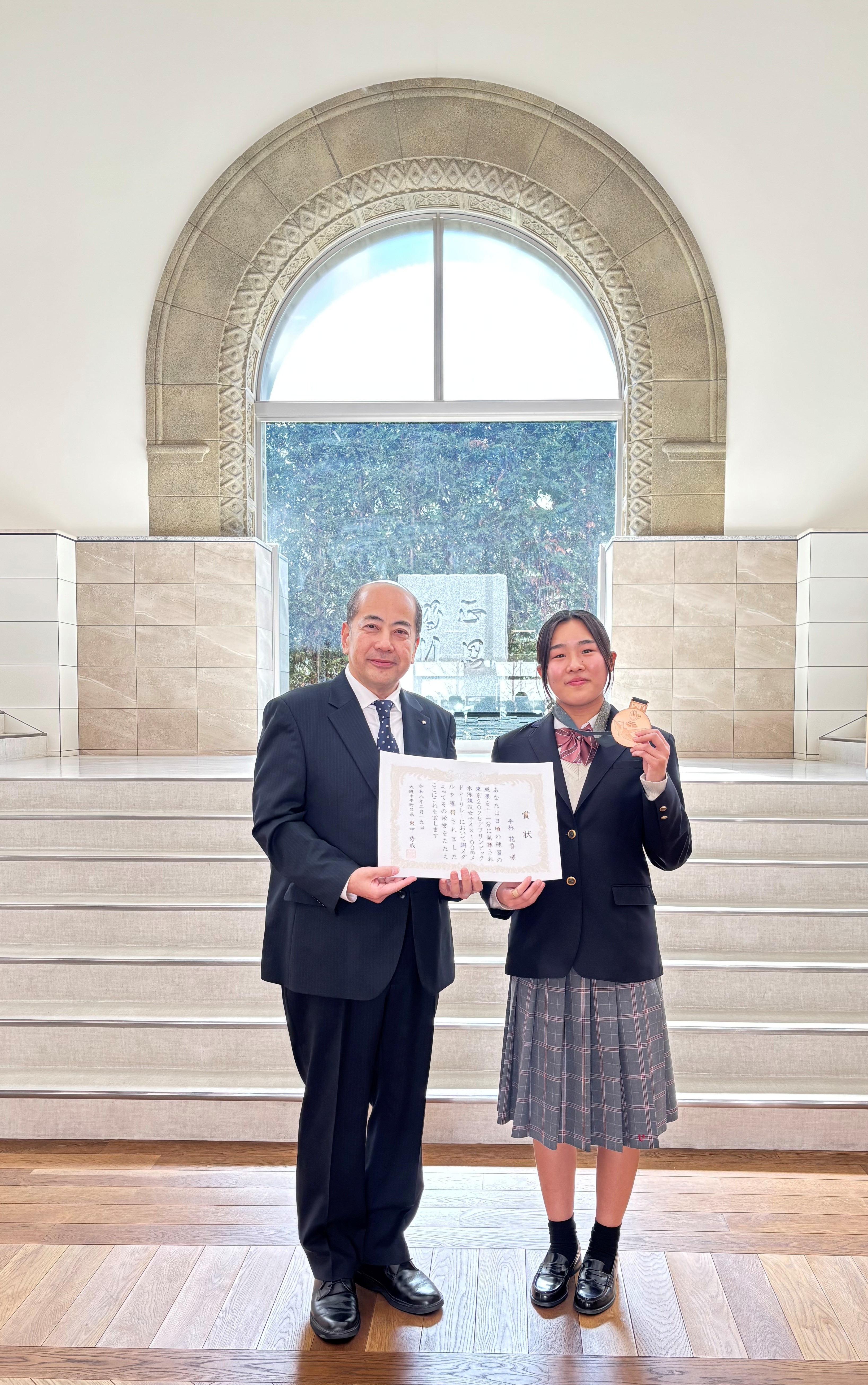 この栄誉を称え、令和8年2月19日(木曜日)、在校される上宮学園中学校・高等学校さんに訪問させていただき、全校生徒さんの前で、平林さんを表彰させていただきました。