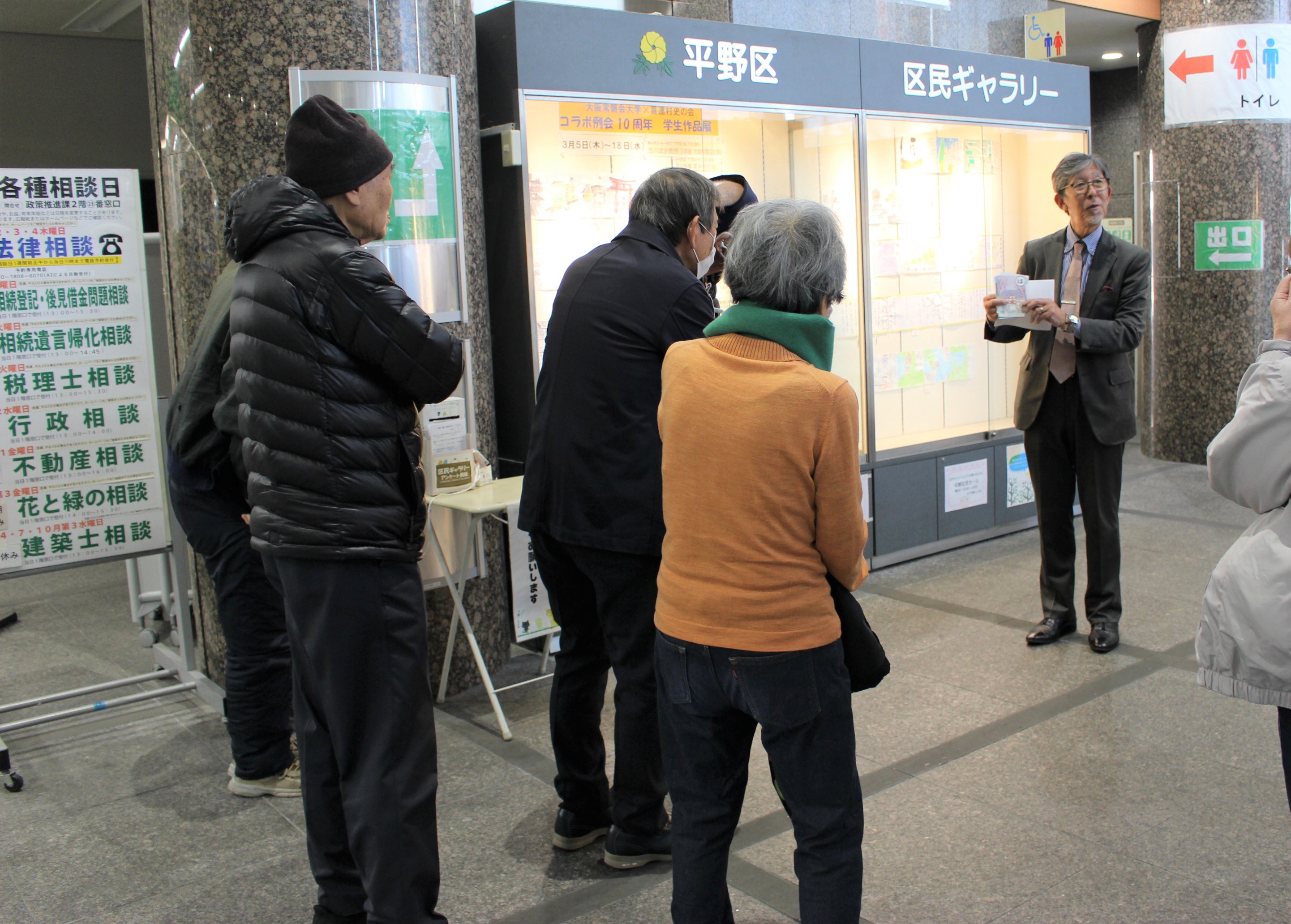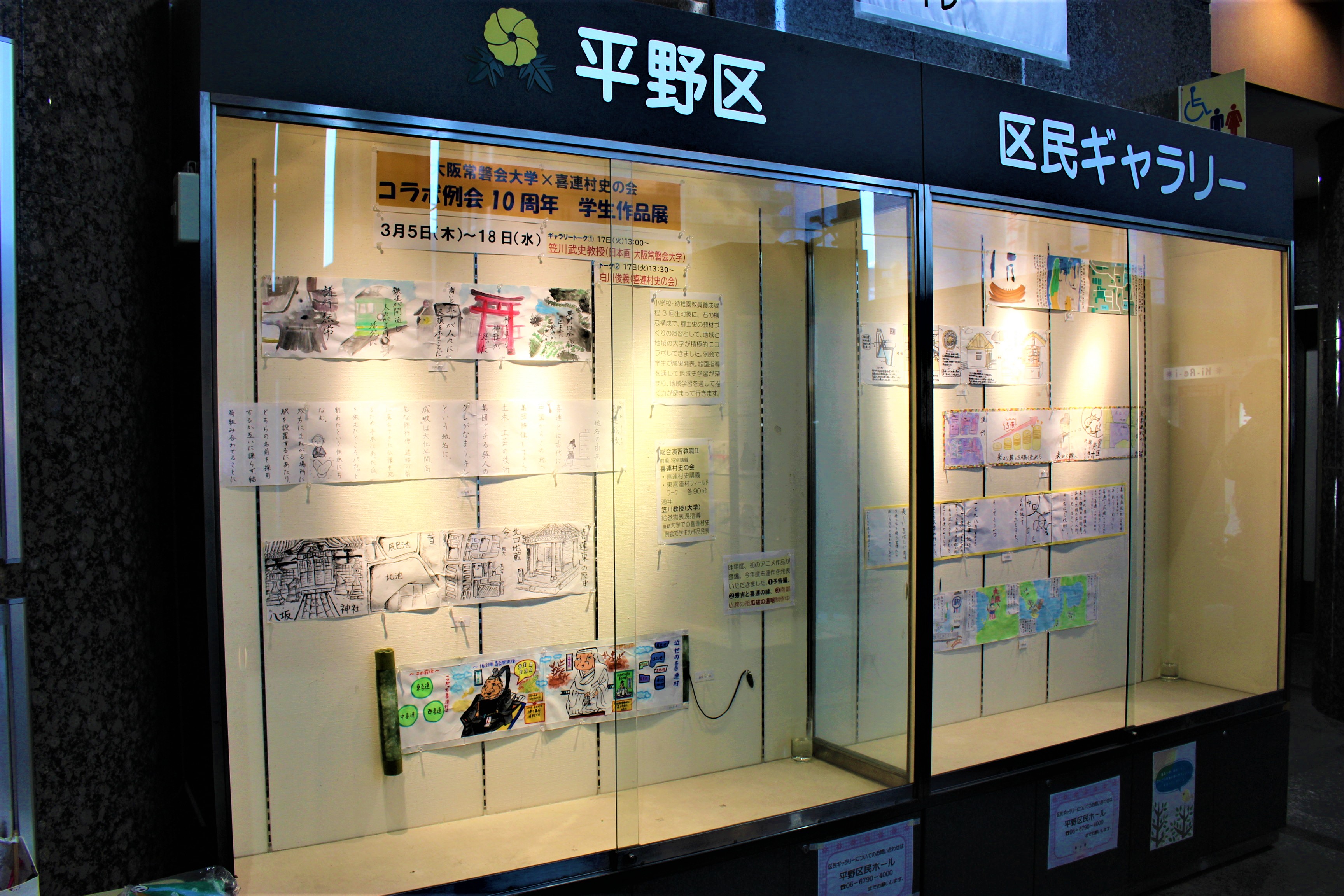 区内にある大阪常磐会大学と、喜連地域の歴史を守り伝える活動をされている「喜連村史の会」とのコラボ企画として、3月5日から18日まで、平野区役所1階の区民ギャラリーにおいて学生作品展が開催されました。