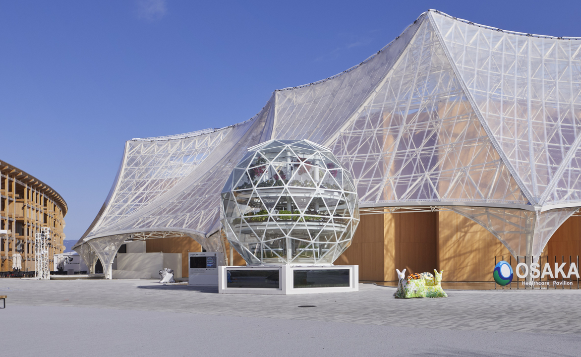 こどもたちに自然界におけるサステナブルな循環の大切さを伝えるとともに、SDGs達成への貢献をめざす取組の一つとして、大阪ヘルスケアパビリオンの正面に直径7メートルのガラスドーム状のアクアポニックスを展示しました。その具体化においては、増田昇大阪府立大学名誉教授や、北宅善昭大阪公立大学植物工場研究センター長をはじめとした大阪公立大学植物工場研究センターの関係の方々にご尽力をいただきました。