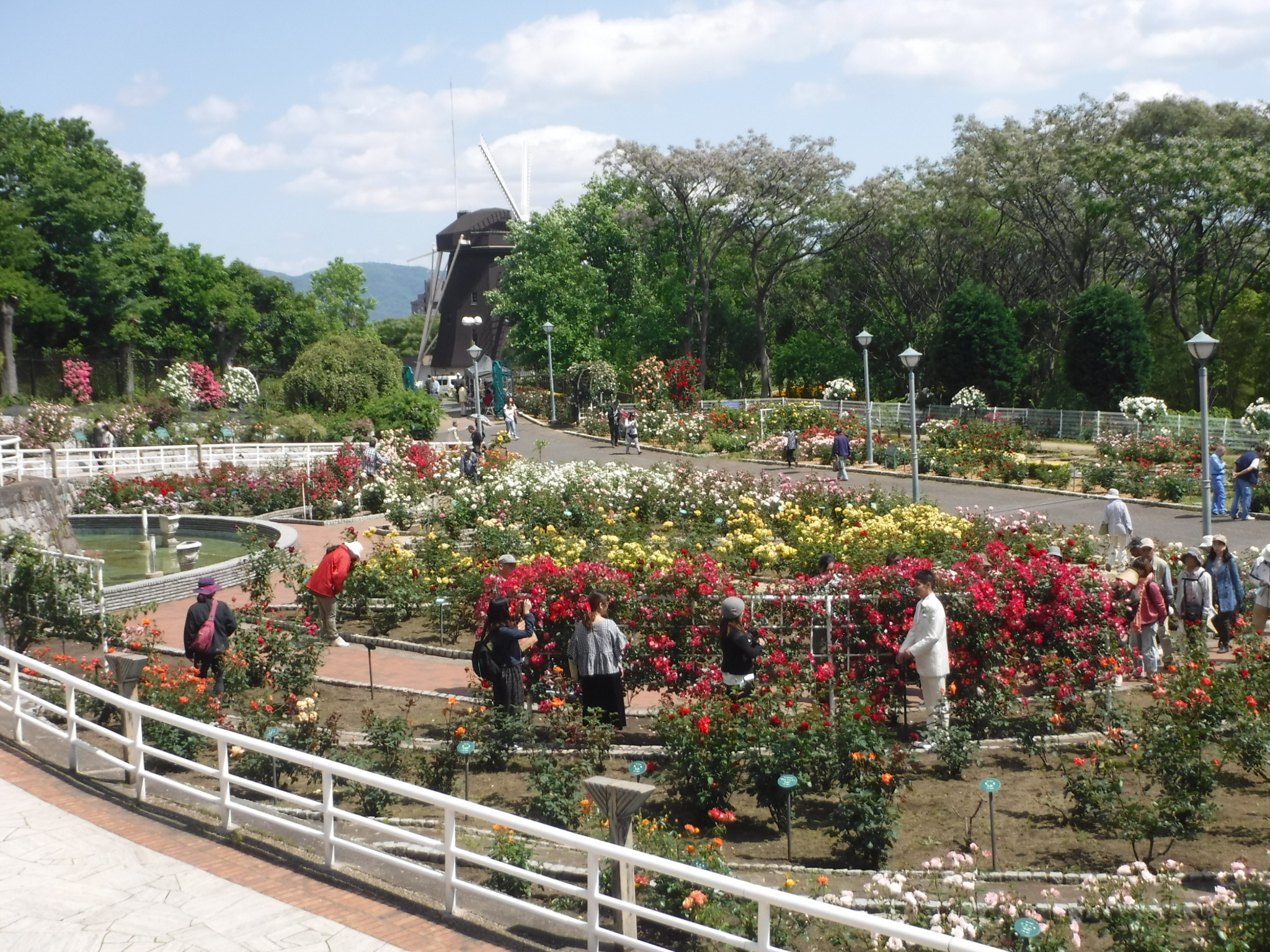 鶴見緑地バラ園は、風車の丘広場の西側に位置し、平成2年に開催された花の万博に出展され好評を博した施設です。花の万博終了後、周辺施設の整備とあわせて、平成4年4月より公開しています。