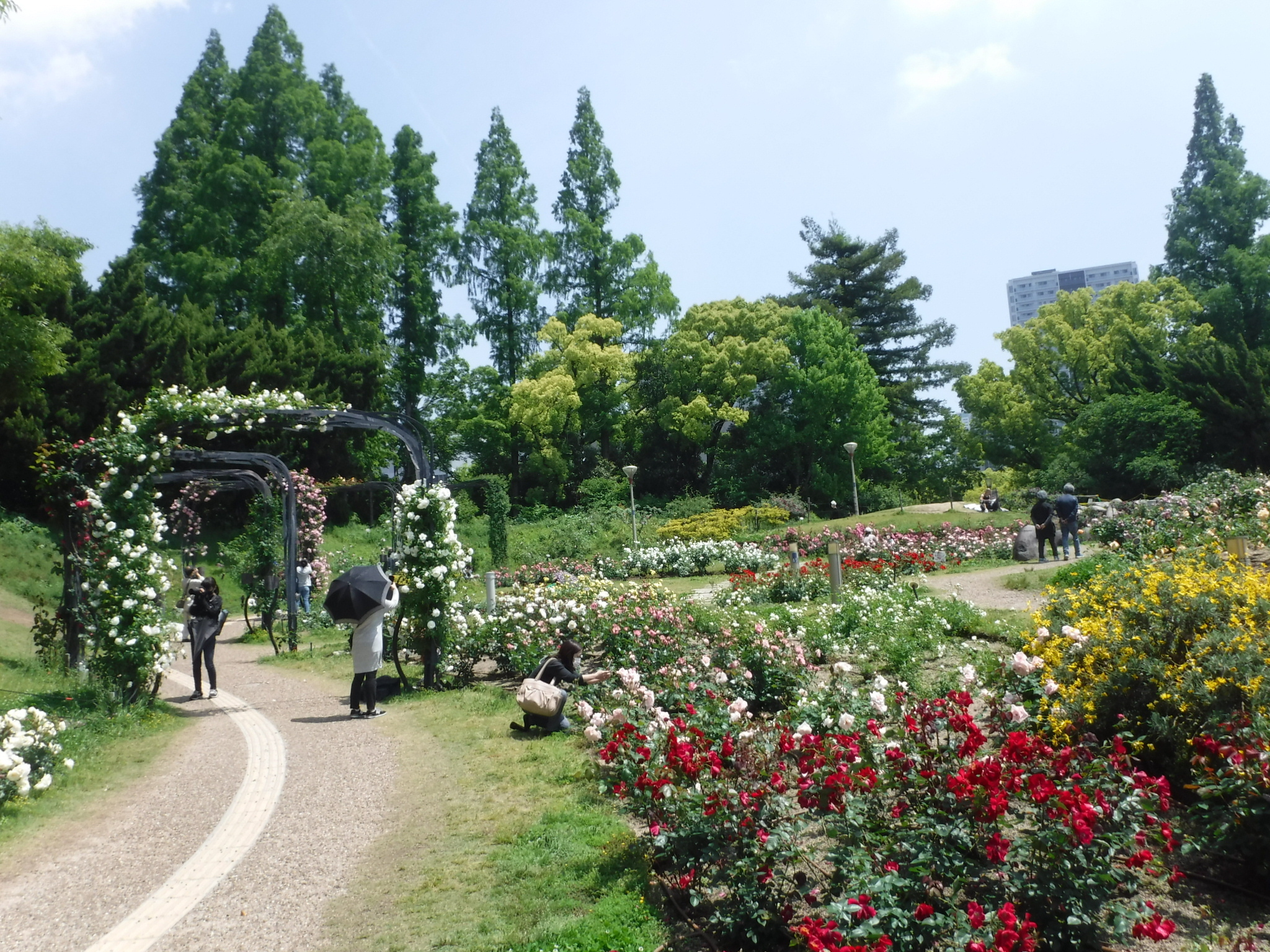 面積約9,000平方メートルのバラ園には、約160品種、約2,600株のバラが植栽されており、東洋のバラを含んだバラの鮮やかな色彩とそのハーモニーを自然な形で見せる「ナチュラル&カジュアル」をテーマとし、西から東に緩やかに起伏する土地の形状を活かして、東を山、そこから西に里山、田園、街を経て、西に海が広がる「大阪のマチ構造」を表現しています。この「大阪のマチ構造」と一体化させる形で、バラの品種の発展に寄与した日本や東洋の野生バラから現代のバラに至るまでのバラの変遷を「バラの歴史の流れ」として植栽し、それぞれに特色のある鮮やかなバラの景色を創りだしています。