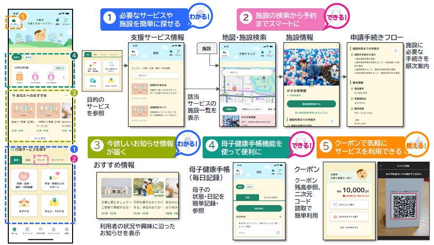 (子育て支援施設検索、利用予約、子育て情報の提供、母子健康手帳機能など)