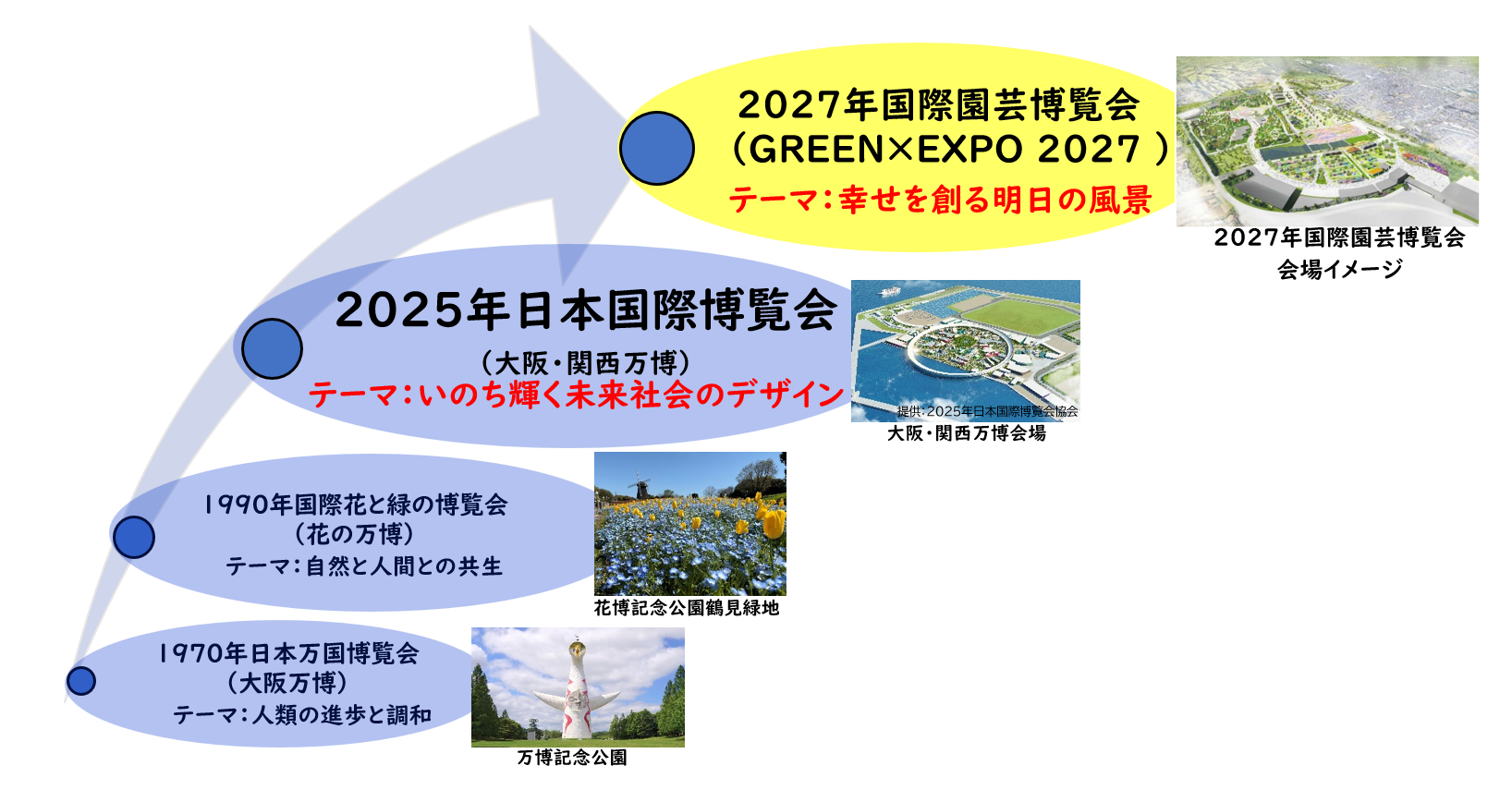 「いのち輝く未来社会のデザイン」をテーマとする大阪・関西万博から、「幸せを創る明日の風景」をテーマとする国際園芸博につながるキーワードとして、一人ひとりが幸せを実感できるウェルビーイングな未来社会を、「花とみどり」豊かな屋外庭園で表現するとともに、みどり豊かで潤いのあるまちづくりを推進する「大都市・大阪」の魅力を国内外に広く発信します。