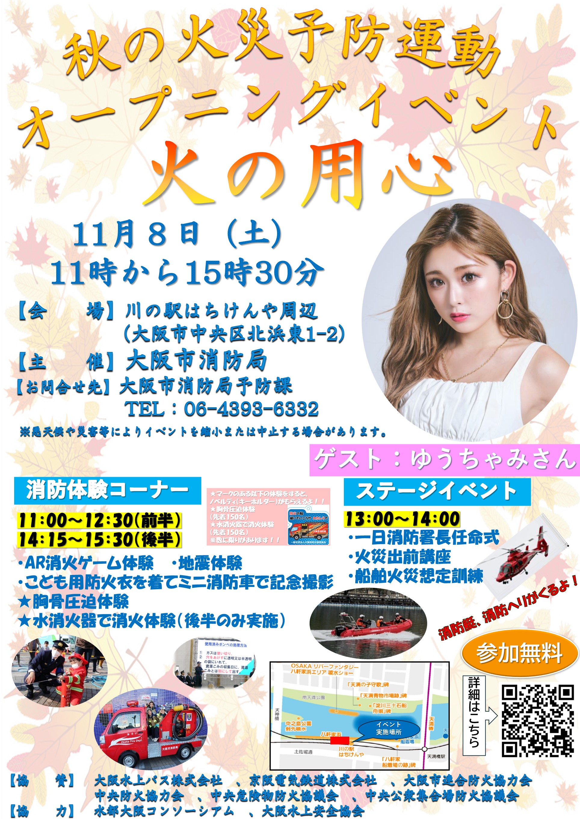 大阪市消防局は、令和7年秋の火災予防運動(令和7年11月9日(日曜日)から11月15日(土曜日)までの一週間)を実施するにあたり、市民の皆さまに火災予防や災害への備えなどについて再認識していただくため、令和7年11月8日(土曜日)にゆうちゃみさんを一日中央消防署長としてお迎えし、オープニングイベントを開催します。