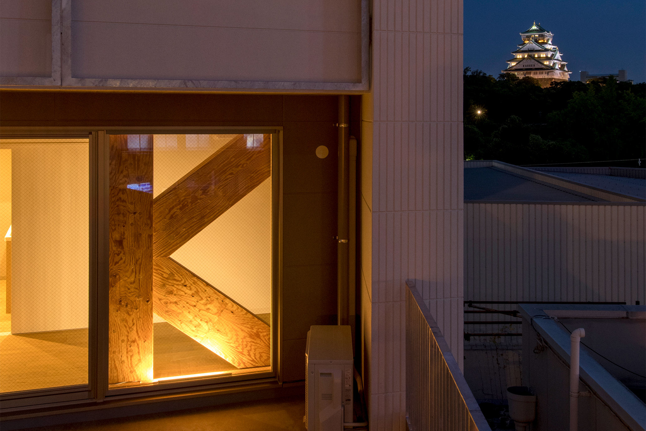 大阪城の北、寝屋川沿いに建つ8階建ての集合住宅である。1階から3階を鉄骨造、4階から8階を木造とした混構造で、木造の採用は中高層住宅における先進的な取り組みとして注目される。事業主の建設会社は、この地に明治35年に木材店として創業した自社の歴史から、自社ビルの建て替えに際し、自社のオフィスが入る木造中高層賃貸住宅を構想したという。木造の中高層住宅という挑戦的な試みは、事業主の熱い想いに賛同する地元関係者や銀行の後押しによって実現された。木構造をそのまま現した居心地の良い木質の室内空間は、窓の外に大きく見える大阪城天守閣とともに、この住宅の大きな魅力となっている。