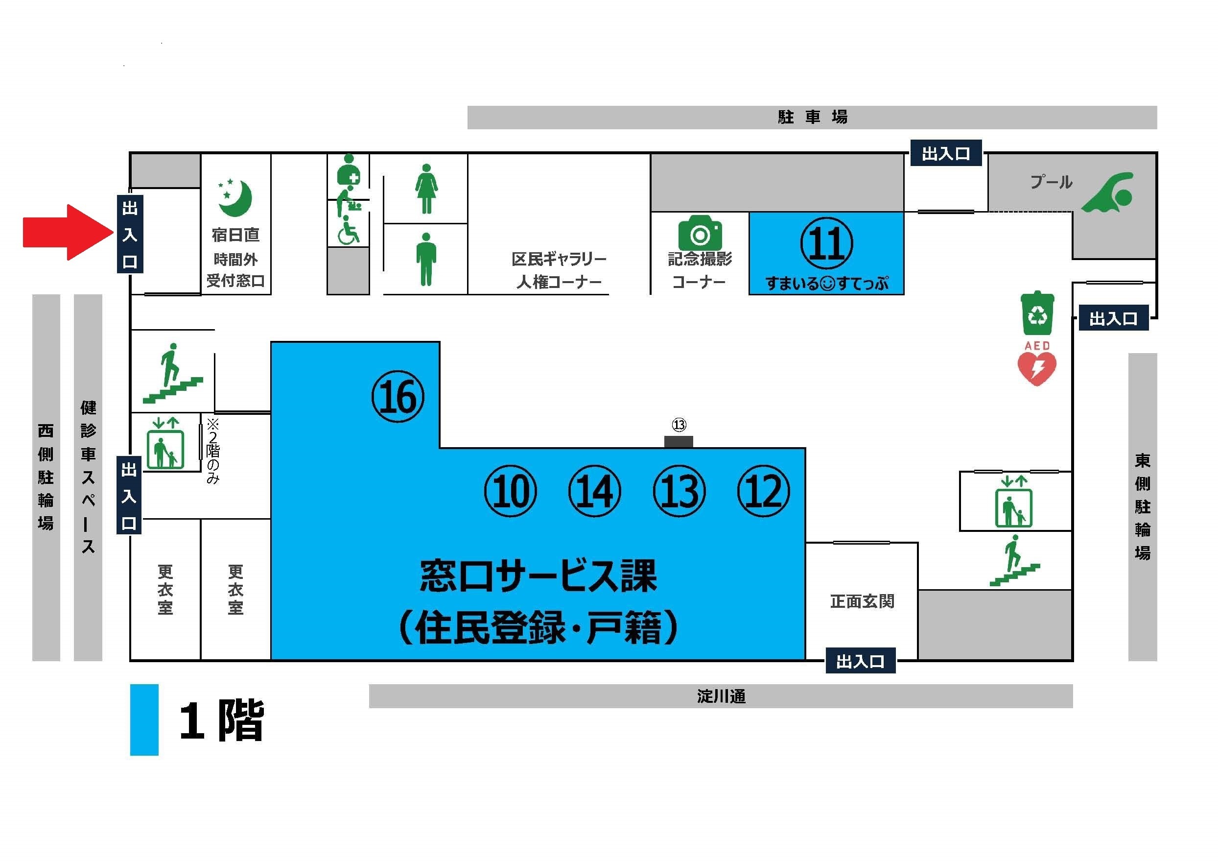 会議開催が閉庁時間となるため、区民の皆様の混乱を招かないよう、午後5時30分以降は正面玄関を閉めますので、ご来場の際には、時間外受付窓口のある出入口をご利用ください。(下図参照)