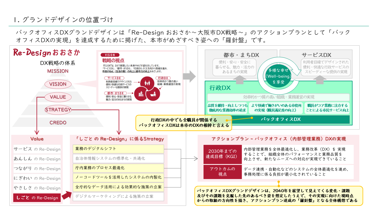 バックオフィスDXグランドデザインは「Re-Design おおさか~大阪市DX戦略~」のアクションプランとして「バックオフィスDXの実現」を達成するために掲げた、本市がめざすべき姿への「羅針盤」です。