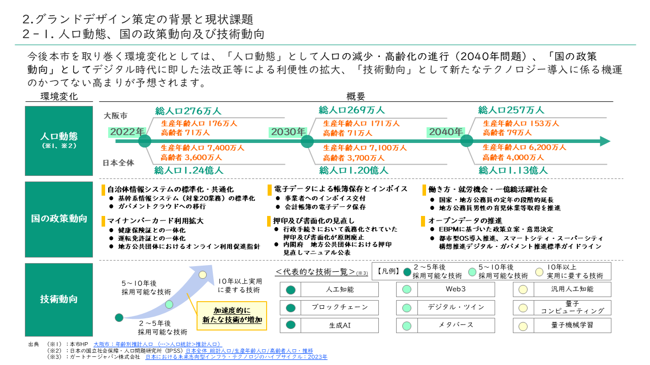 今後本市を取り巻く環境変化としては、「人口動態」として人口の減少・高齢化の進行(2040年問題)、「国の政策動向」としてデジタル時代に即した法改正等による利便性の拡大、「技術動向」として新たなテクノロジー導入に係る機運のかつてない高まりが予想されます。