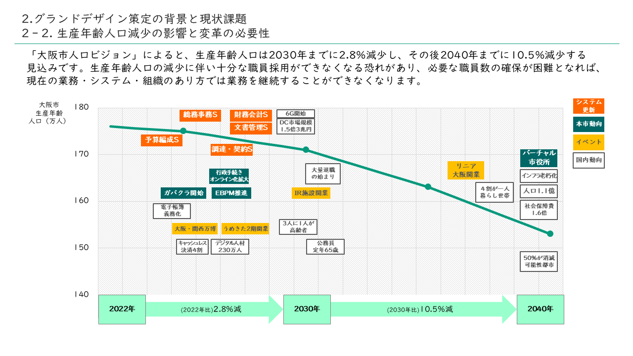 「大阪市人口ビジョン」によると、生産年齢人口は2030年までに2.8%減少し、その後2040年までに10.5%減少する見込みです。生産年齢人口の減少に伴い十分な職員採用ができなくなる恐れがあり、必要な職員数の確保が困難となれば、現在の業務・システム・組織のあり方では業務を継続することができなくなります。