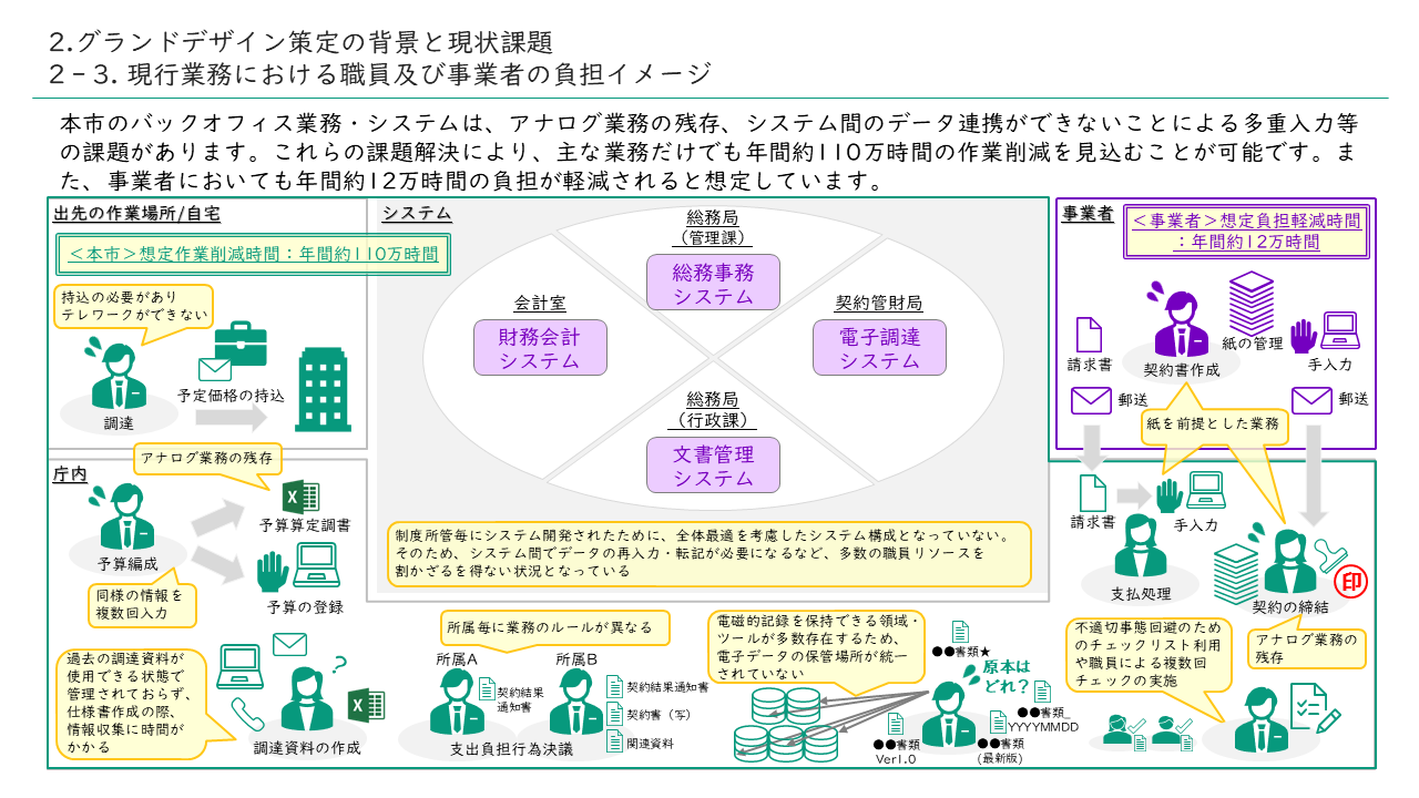 本市のバックオフィス業務・システムは、アナログ業務の残存、システム間のデータ連携ができないことによる多重入力等の課題があります。これらの課題解決により、主な業務だけでも年間約110万時間の作業削減を見込むことが可能です。
