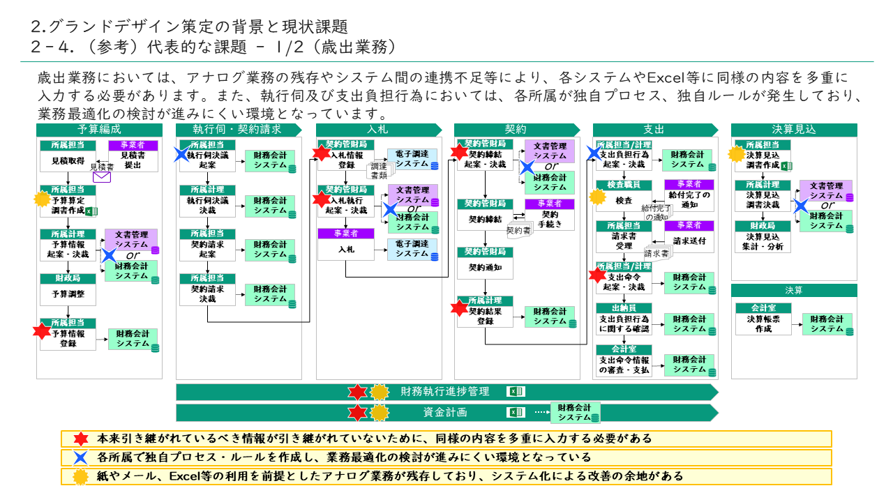 歳出業務においては、アナログ業務の残存やシステム間の連携不足等により、各システムやExcel等に同様の内容を多重に入力する必要があります。