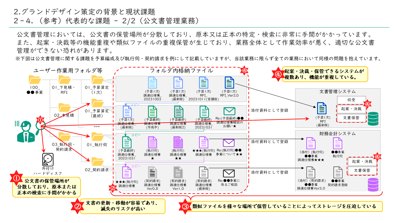 また、起案・決裁等の機能重複や類似ファイルの重複保管が生じており、業務全体として作業効率が悪く、適切な公文書管理ができない恐れがあります。