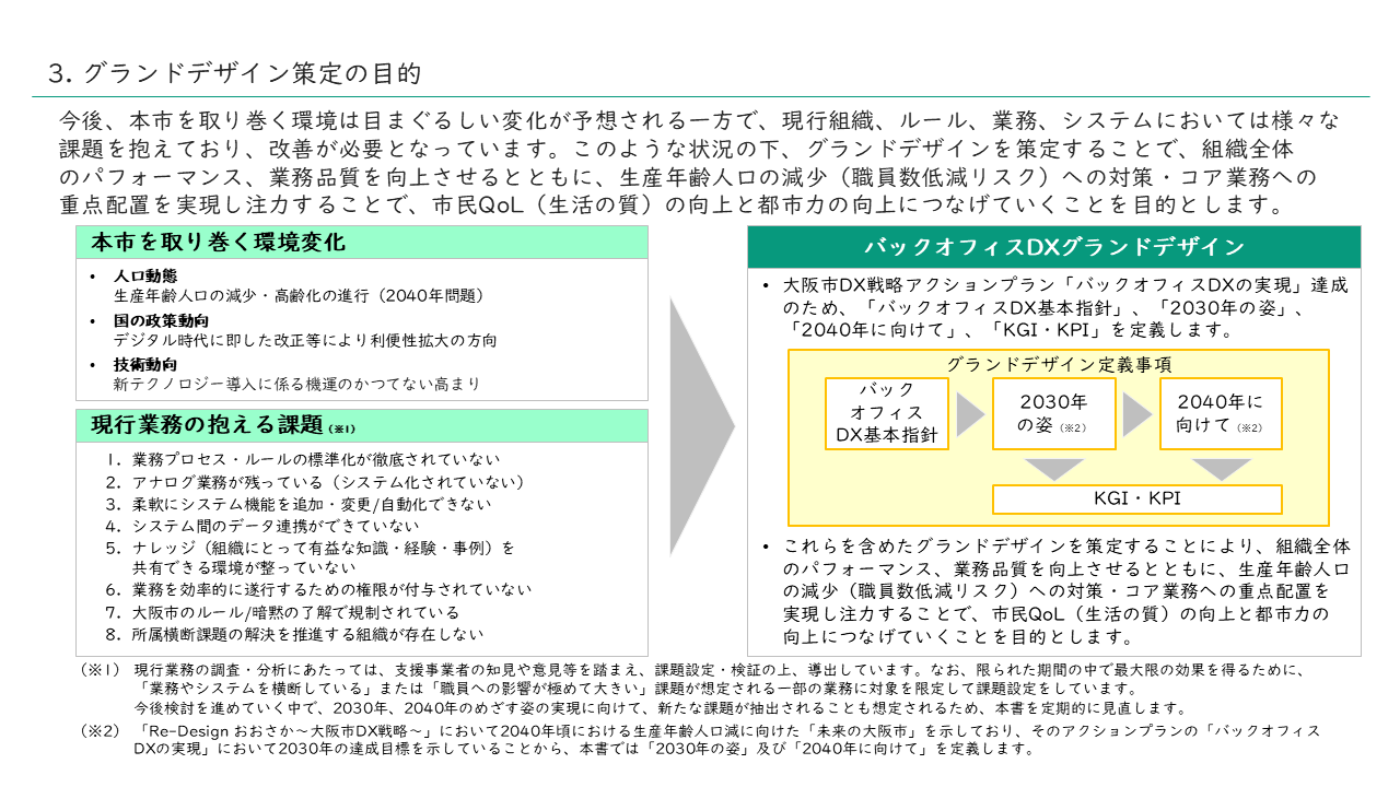 このような状況の下、グランドデザインを策定することで、組織全体のパフォーマンス、業務品質を向上させるとともに、生産年齢人口の減少(職員数低減リスク)への対策・コア業務への重点配置を実現し注力することで、市民QoL(生活の質)の向上と都市力の向上につなげていくことを目的とします。