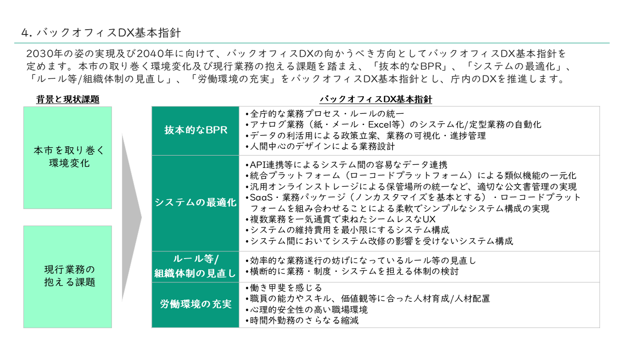こうした本市の取り巻く環境変化及び現行業務の抱える課題を踏まえ、「抜本的なBPR」、「システムの最適化」、「ルール等/組織体制の見直し」、「労働環境の充実」をバックオフィスDX基本指針とし、本市がめざすべき姿への羅針盤としてバックオフィスDXグランドデザインを策定しました。