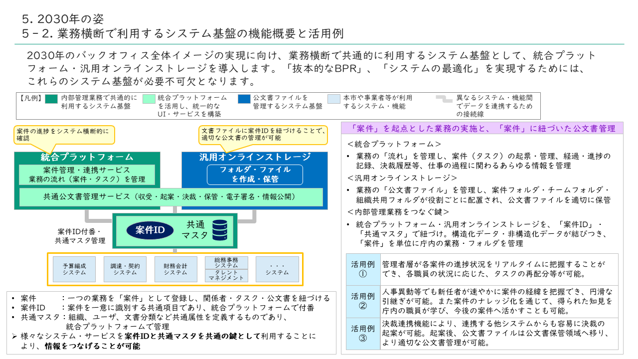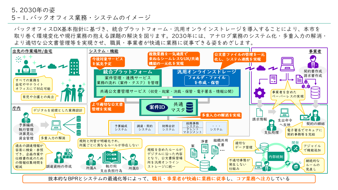 2030年のバックオフィス全体イメージの実現に向け、業務横断で共通的に利用するシステム基盤として、統合プラットフォーム・汎用オンラインストレージを導入します。