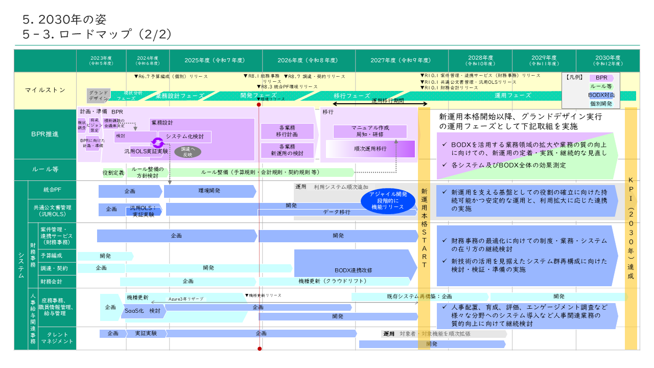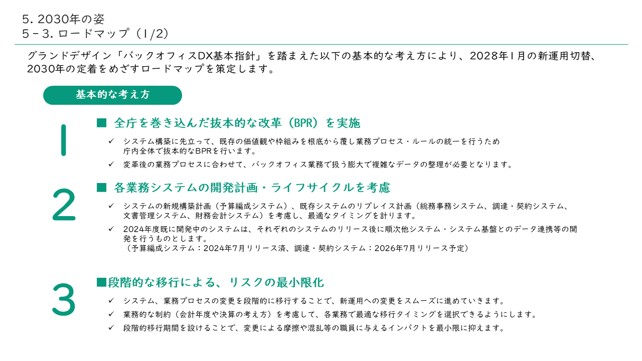 グランドデザイン「バックオフィスDX基本指針」を踏まえた以下の基本的な考え方により、2028年1月の新運用切替、2030年の定着をめざすロードマップを策定します。