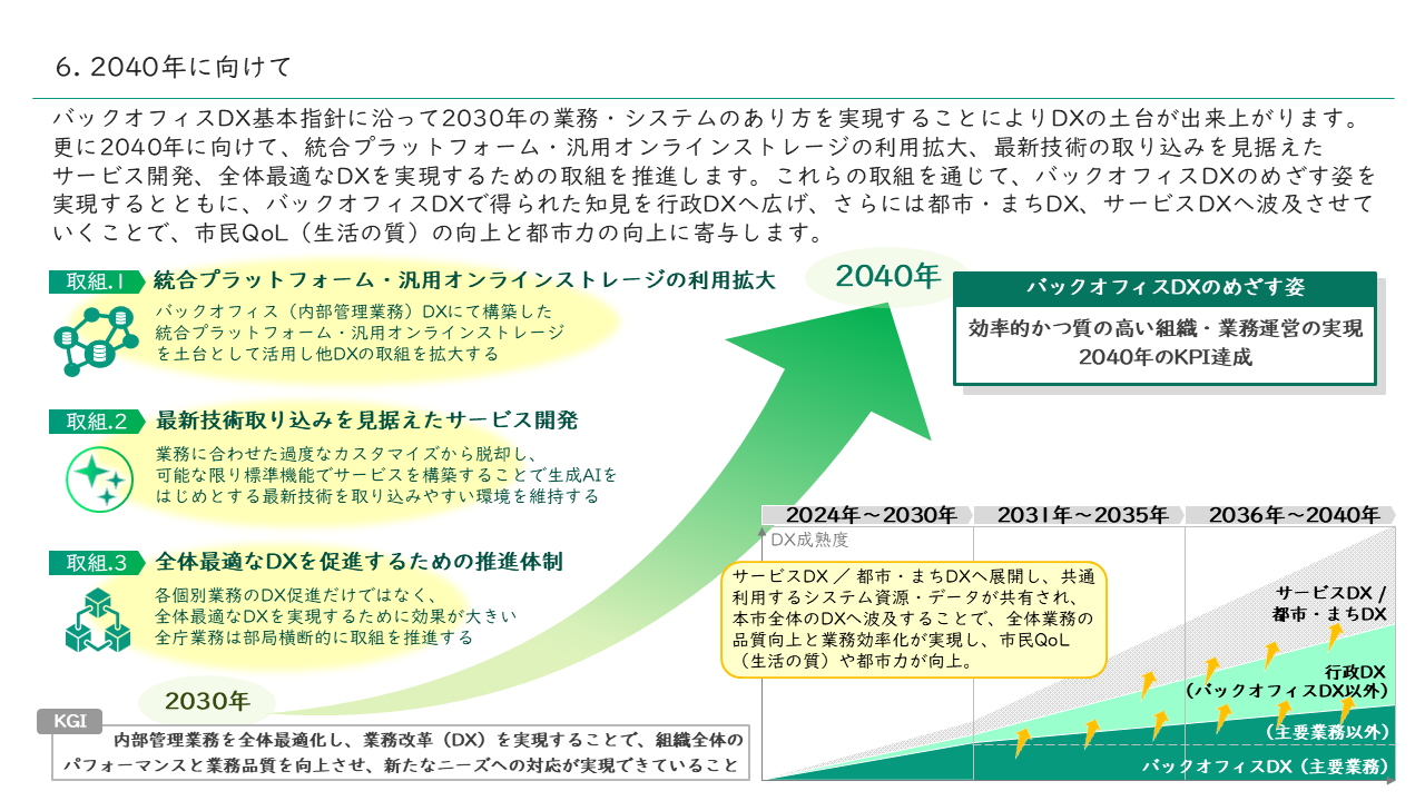 更に2040年に向けて、統合プラットフォーム・汎用オンラインストレージの利用拡大、最新技術の取り込みを見据えたサービス開発、全体最適なDXを実現するための取組を推進します。