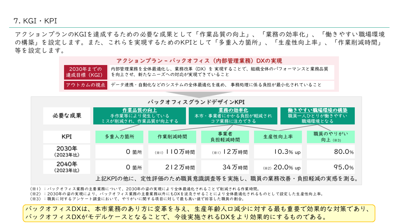 また、これらを実現するためのKPIとして「多重入力箇所」、「生産性向上率」、「作業削減時間」等を設定します。