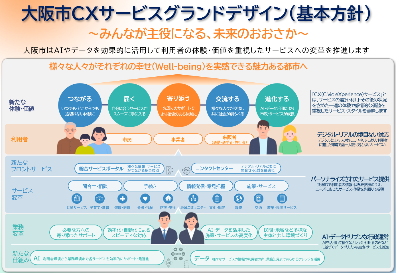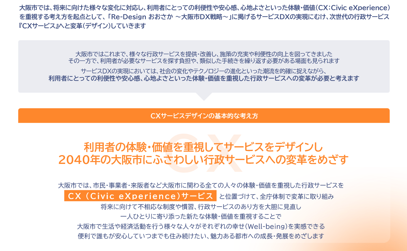 大阪市では、市民・事業者・来阪者など大阪市に関わる全ての人々の体験・価値を重視した行政サービスをCX (Civic eXperience)サービス と位置づけて、全庁体制で変革に取り組み、将来に向けて不相応な制度や慣習、行政サービスのあり方を大胆に見直し、一人ひとりに寄り添った新たな体験・価値を重視することで、大阪市で生活や経済活動を行う様々な人々がそれぞれの幸せ(Well-being)を実感できる、便利で誰もが安心していつまでも住み続けたい、魅力ある都市への成長・発展をめざします。