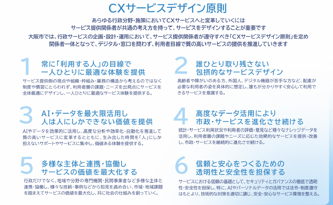 大阪市では、行政サービスの企画・設計・運用において、サービス提供関係者が遵守すべき「CXサービスデザイン原則」を定め、関係者一体となって、利用者目線で質の高いサービスの提供を推進していきます。