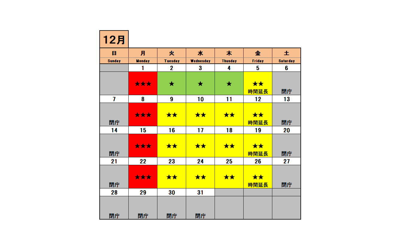 生野区役所4階(47番・48番)窓口サービス課(保険年金)混雑予想カレンダー【12月】