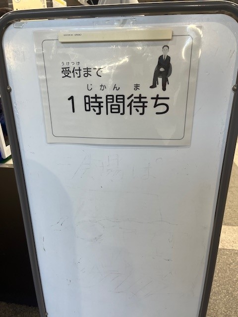 令和7年4月、生野区役所1階住民情報窓口の待ち時間について、来庁者にわかりやすくボードを作成し、混雑時に掲示することとしました。