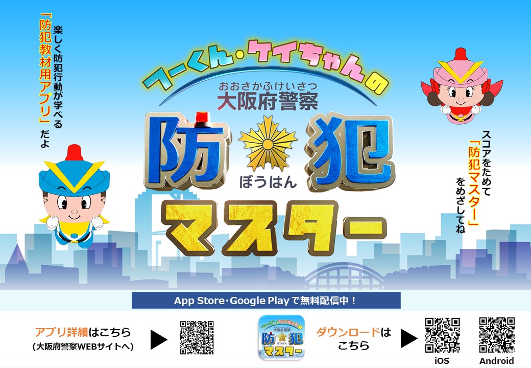 大阪府警察が企業と協働し、子どもが楽しく防犯知識を習得できるアプリ「フーくん・ケイちゃんの防犯マスター」を開発しました。