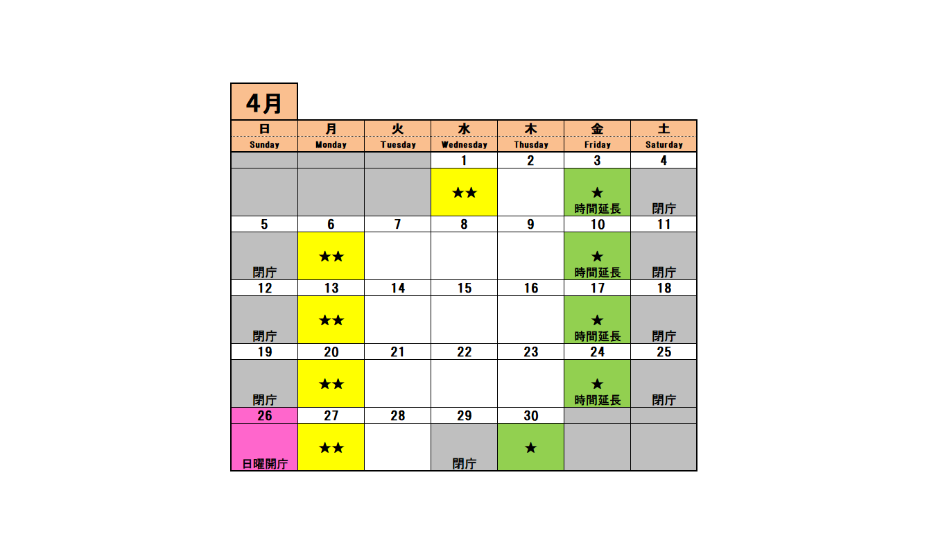 毎月第4日曜日開庁の窓口時間は 9時から17時30分
