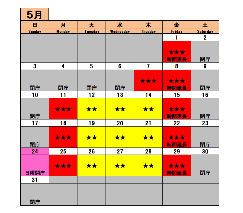生野区役所4階(47番・48番)窓口サービス課(保険年金)混雑予想カレンダー【5月】