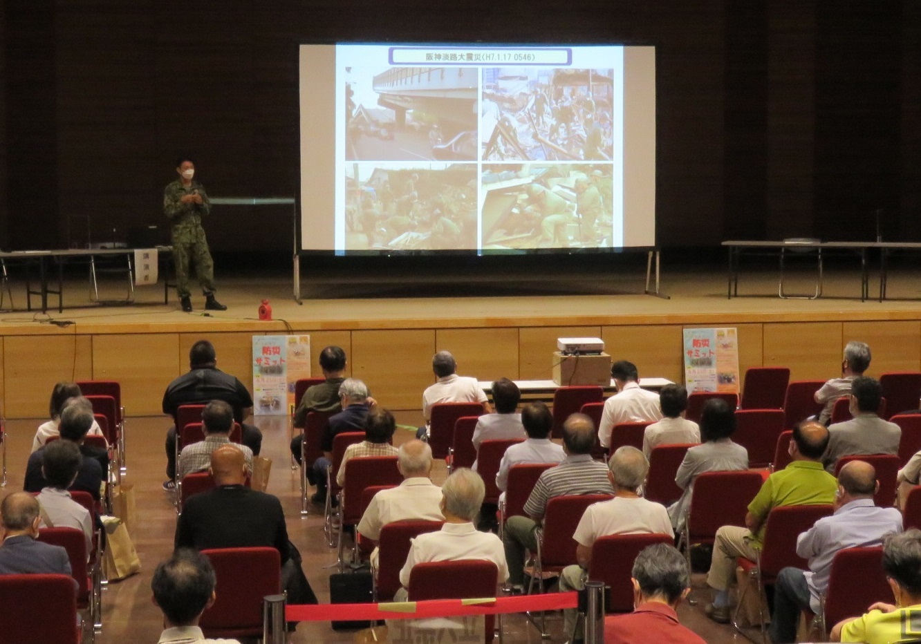 スギタクレストホールでは自衛隊、国土交通省、消防局、水道局による災害派遣現場での活動の講演が実施されたほか、災害時の情報収集に活躍するドローンによる区役所周辺の空撮映像を見ていただきました。