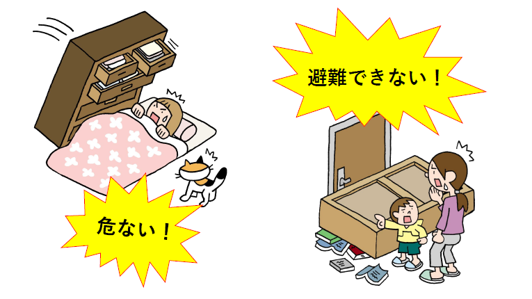 阪神淡路大震災では多くの方が、家具転倒による窒息死・圧死で亡くなられました。地震により家具が転倒しても、下敷きにならないよう金具で家具を固定する、出入口をふさがないような位置に配置する等の対策をしましょう。