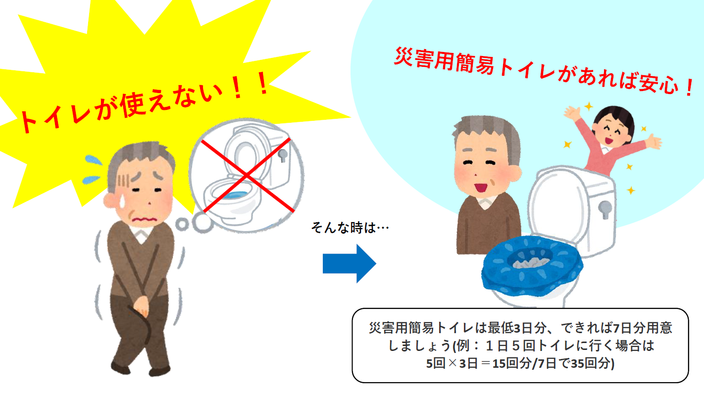 水害や地震の影響でトイレが長期間使用できなくなる場合があります。故障したトイレをそのまま使用すると、汚水があふれかえる可能性もあります。災害に備え最低3日分、できれば7日分の簡易トイレを準備しておきましょう。