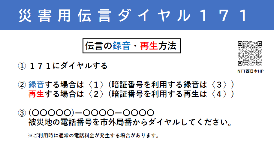 「災害用伝言ダイヤル171」をご存じですか?大災害発生時は、安否確認などの電話が急増し、電話がつながりにくい状況が続きます。家族で安否を確認しあう方法として、「災害用伝言ダイヤル171」を活用しましょう!毎月1日・15日に体験利用が可能です。