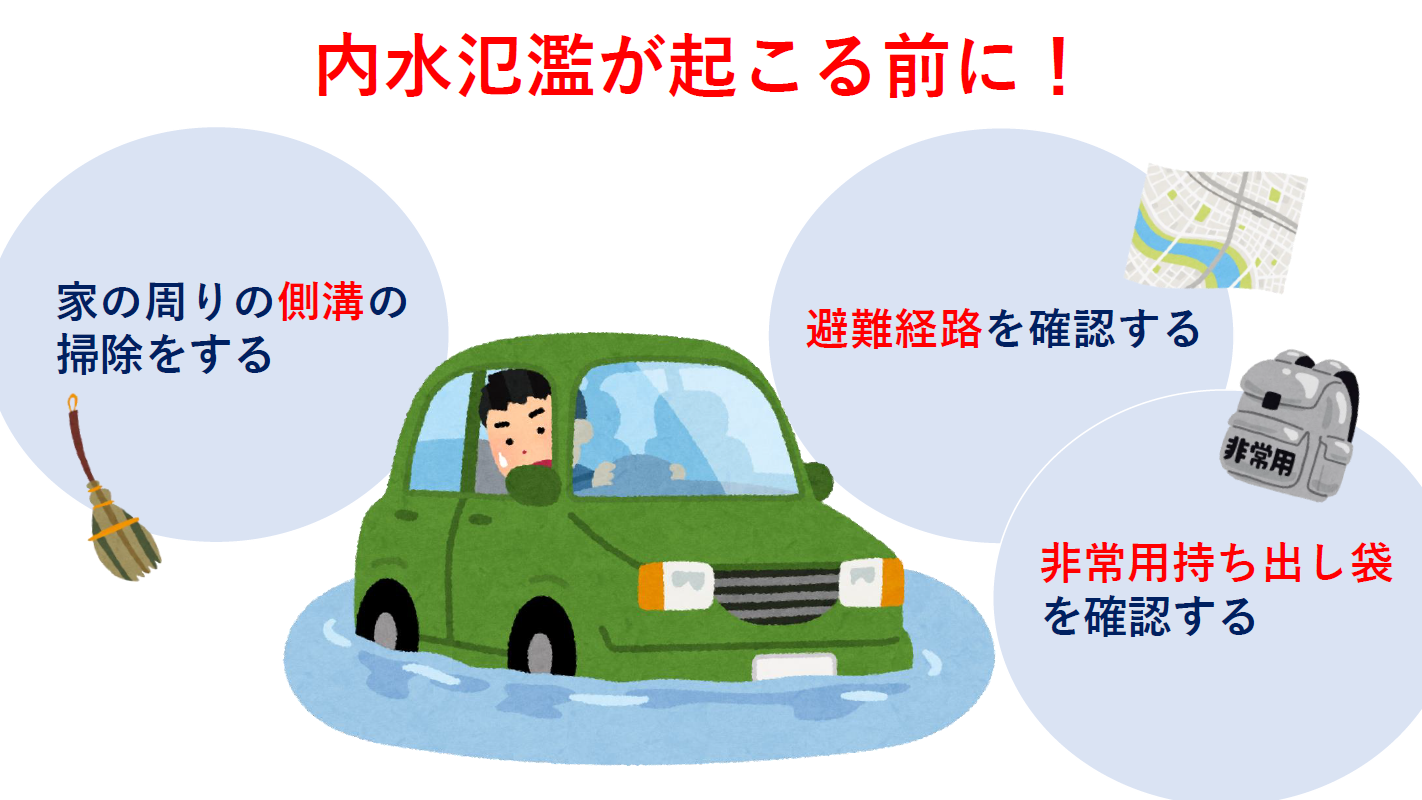 9月は台風の上陸や接近が多い月です。大雨が下水道や側溝等の排水能力を上回り、マンホールなどから水があふれ出す「内水氾濫」が発生する可能性が高くなります。日常的に側溝の掃除や避難経路の確認など、事前の備えを行いましょう。