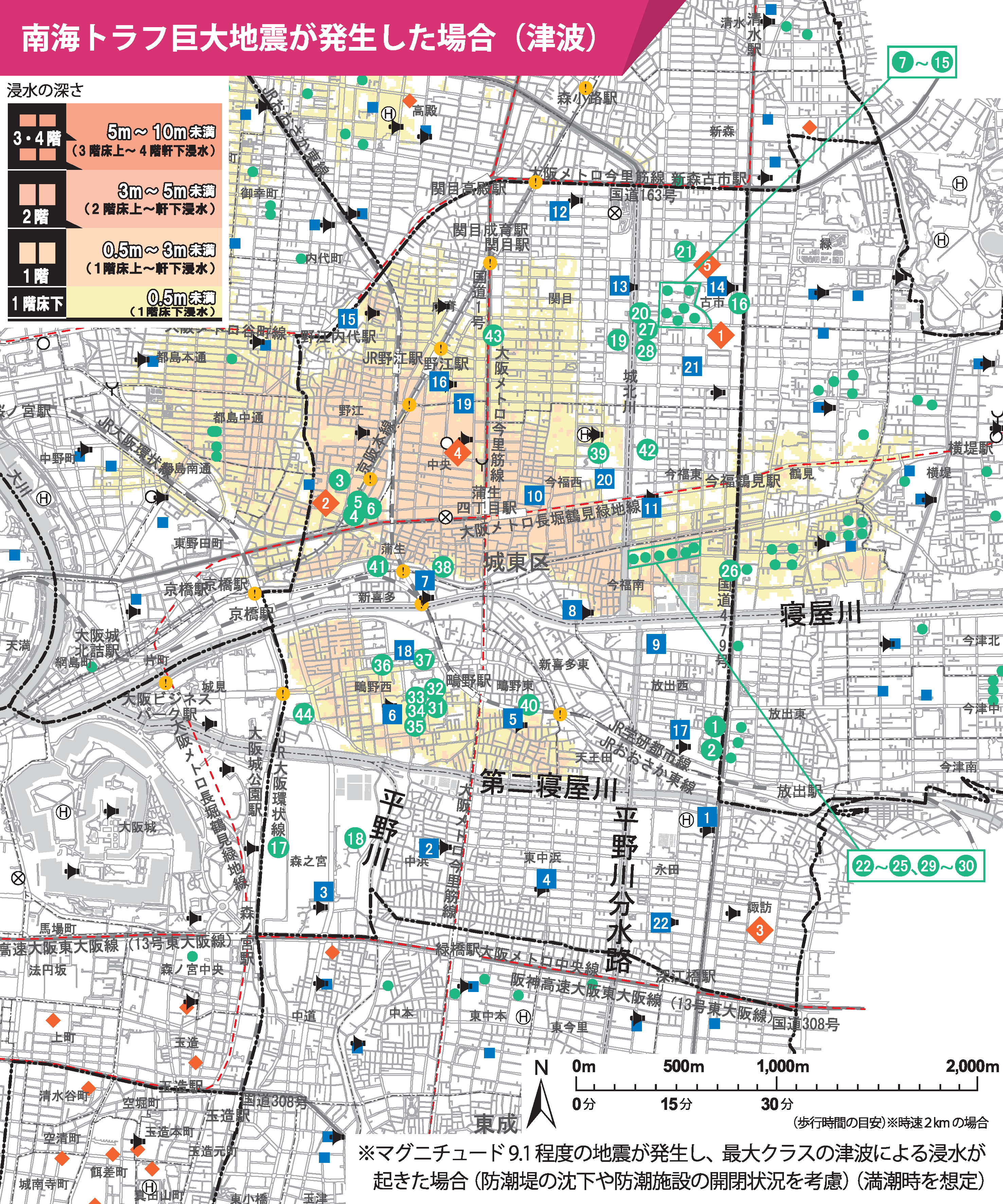 南海トラフ巨大地震が発生した場合、城東区も一部地域は津波により浸水する想定となっています。城東区水害ハザードマップを確認し、自宅周辺の浸水想定や避難場所を確認しておきましょう。