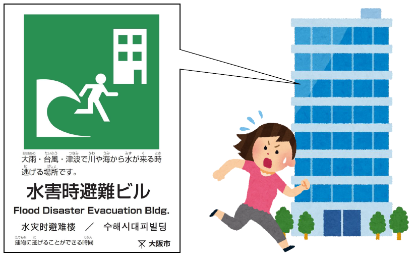 城東区では、水害時に少しでも早く「高い」場所に避難できる一時的な避難場所として「水害時避難ビル」の確保を進めています。いざというときのため、最寄りの「水害時避難ビル」を確認しましょう。