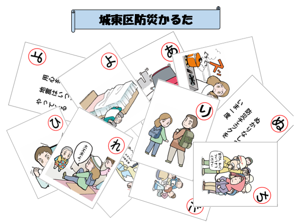 城東区では、子どもたちが「遊び」を通じ、防災の知識や心構えなどを学び、身につけるために「防災かるた」を作成しています。区ホームページに防災かるたの印刷用ファイルを掲載していますので、印刷し、各札を切り離してお使いください。
