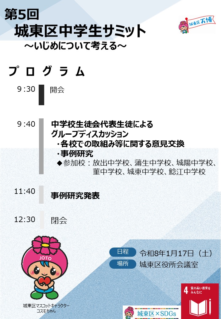 いじめやに関する課題等について生徒が主体的に考え、今後の学校生活においても、その成果を活かしていくことを目的とし、令和8年1月17日(土曜日)、「第5回城東区中学生サミット」を開催しました。