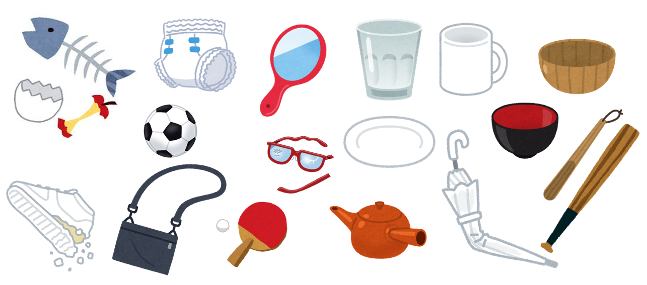 - 竹串、ガラスの破片、カミソリの刃などは厚紙などに包んで袋に『キケン』と表示してからお出しください。