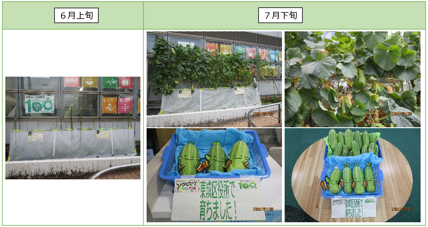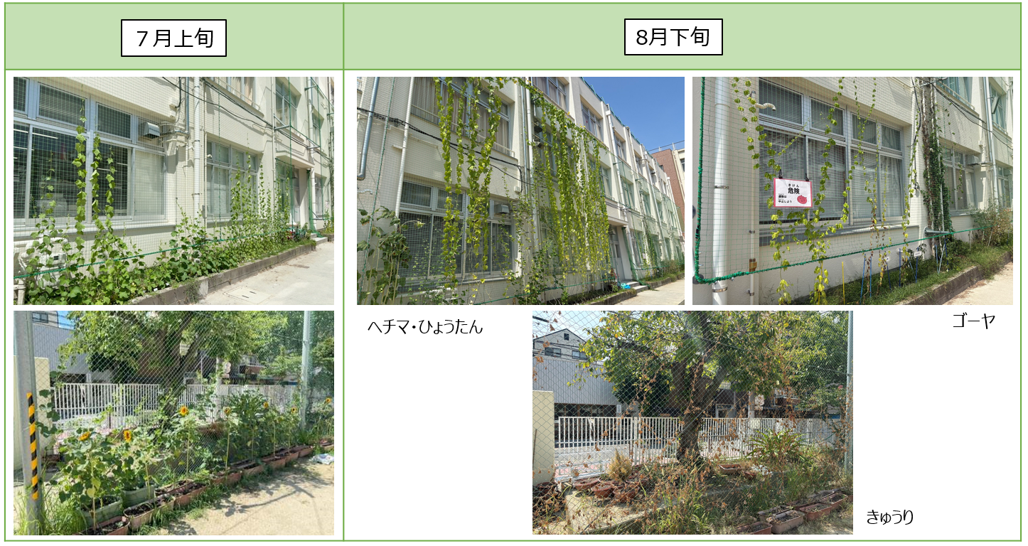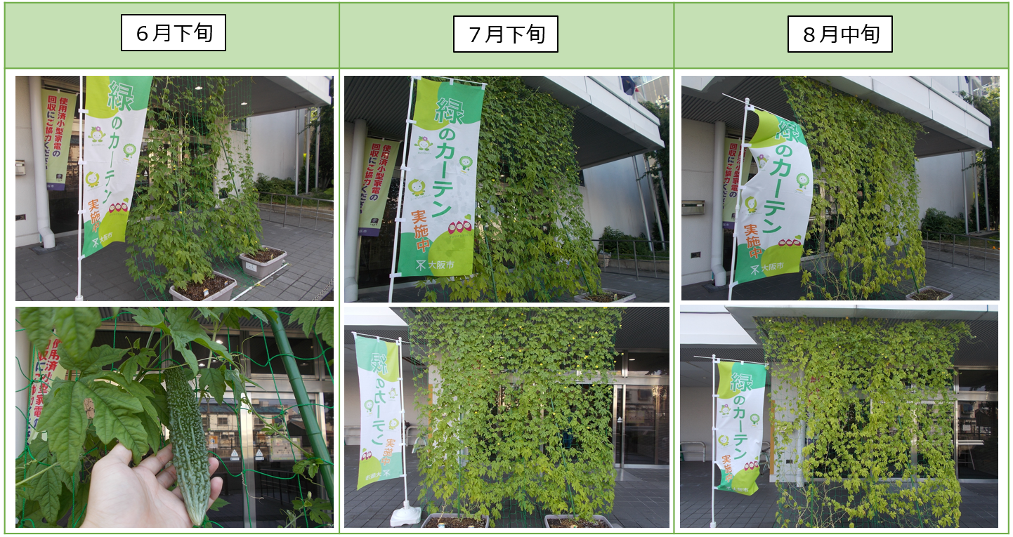 大阪市では、ゴーヤやサツマイモなどを使った緑のカーテン&カーペットづくりを、ヒートアイランド対策の一環として推進しています。