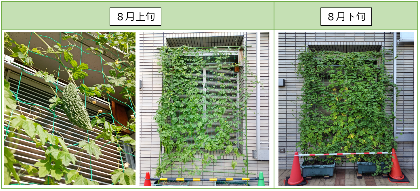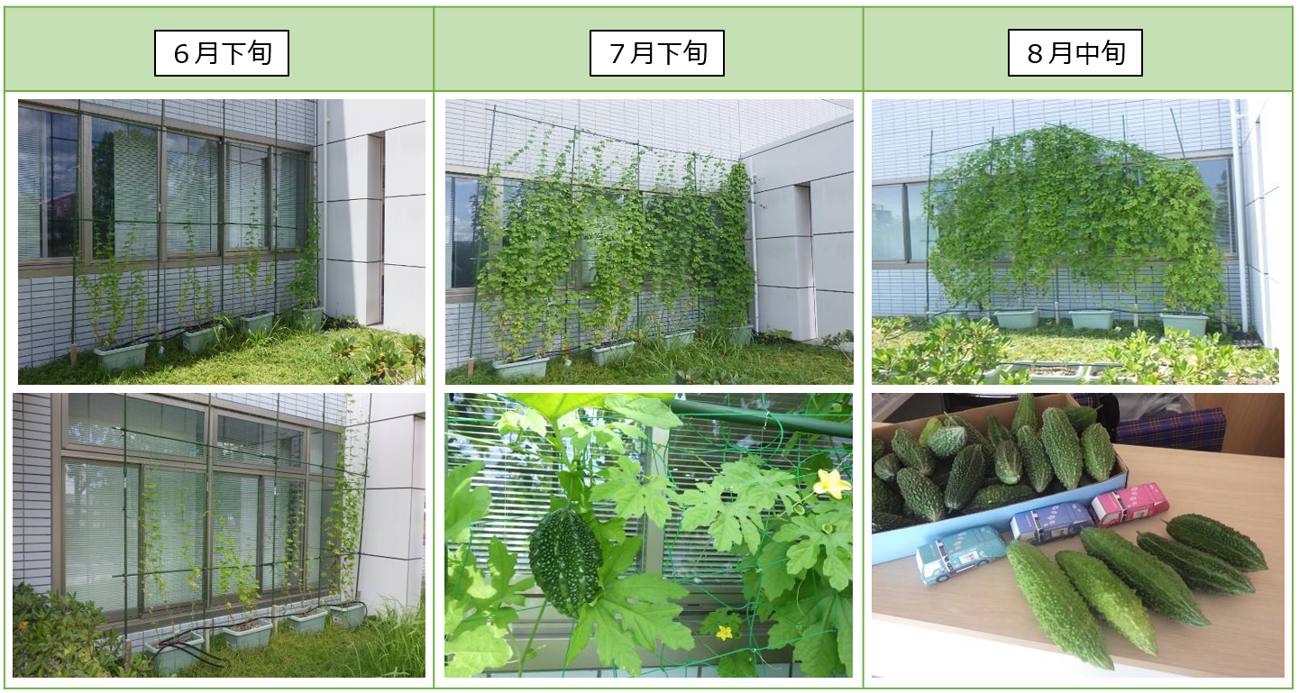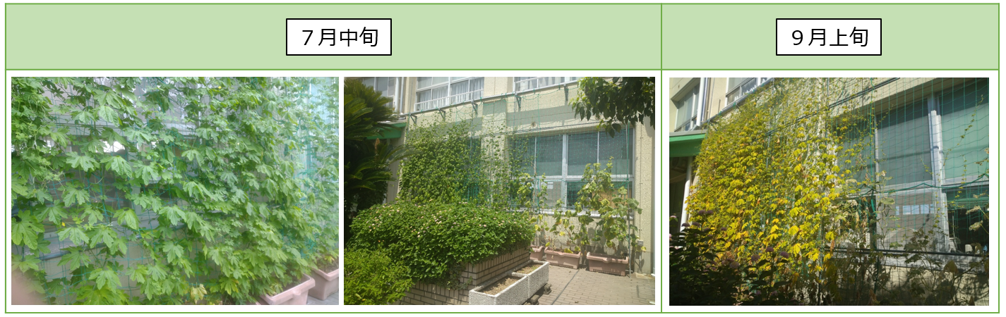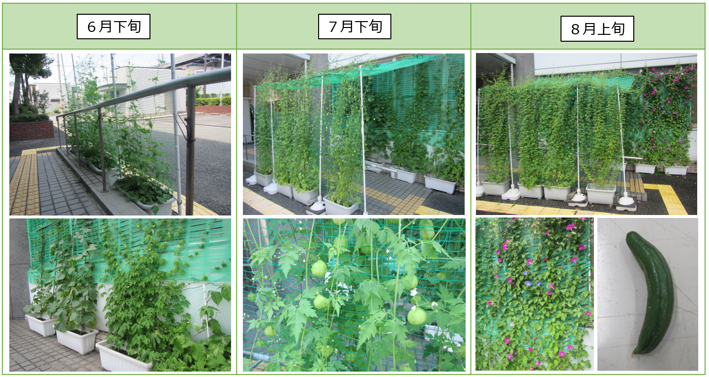 日差しによる室温の上昇を抑えるとともに、植物の葉から水分が蒸発するときに周囲の熱をうばうので、気温を下げることができます。