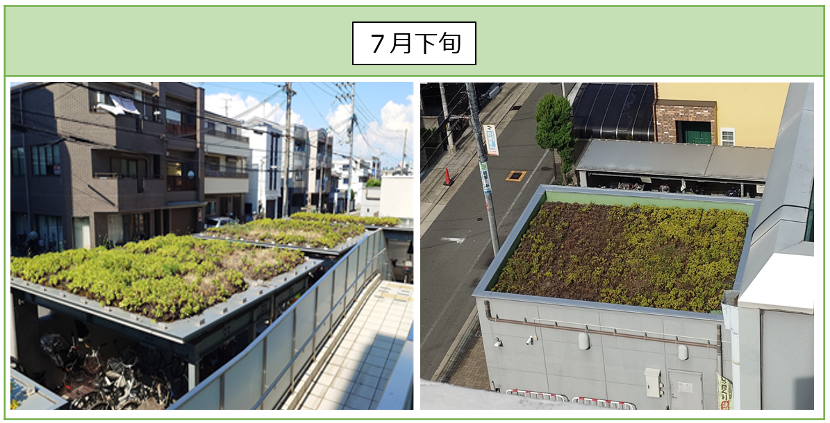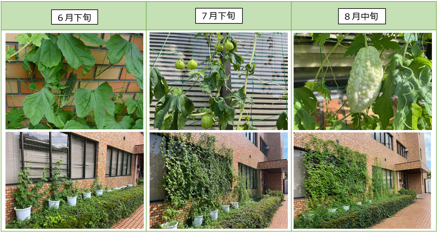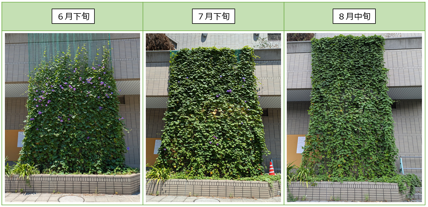 日差しによる室温の上昇を抑えるとともに、植物の葉から水分が蒸発するときに周囲の熱をうばうので、気温を下げることができます。